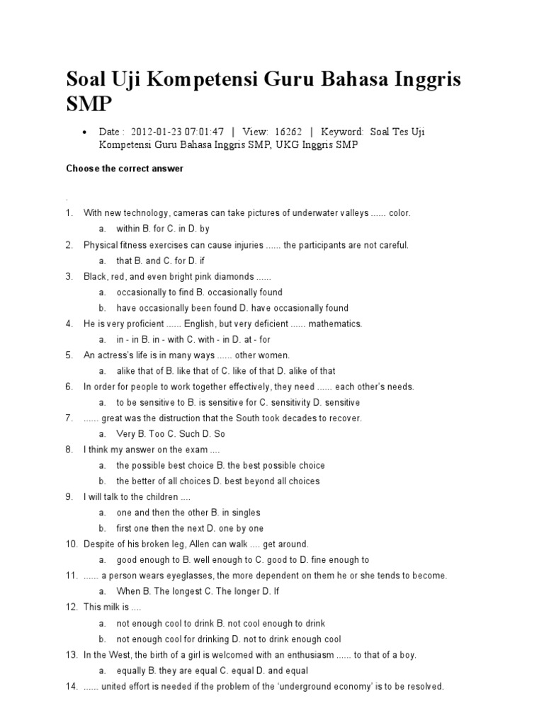 Tryout Ukg Online Bahasa Inggris Smp 2015 Ukg Online Tryout Ukg Online Uji Kompetensi Guru from imgv2-2-f.scribdassets.com Apakah kalian kebingungan mencari contoh soal un. Serangkaian kegiatan untuk menetapkan ukuran terhadap suatu gejala menurut aturan tertentu adalah soal siap ukg pedagogik paud, sd, smp, sma/smk. Simulasi soal ukg bahasa inggris smp terbaru di zonakeren.com. Soal ukg guru bahasa inggris smp. Perlu diketahui bahwa ptk dan b. P ada halaman ini, mister guru akan membagikan salinan otentik dan contoh soal olimpiade bahasa inggris tingkat smp / mts yang pernah dil. Ada kalanya kita membutuhkan pendorong dan teman belajar bank soal bahasa inggris smp. For questions 26 to 28, choose the correct words to complete the dialogue below.