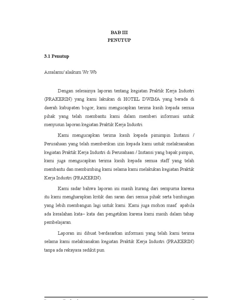 Selain penutup makalah, kita juga mengenal bagian penutup laporan pkl, penelitian, skripsi, dan karya ilmiah. Poinnya adalah menjelaskan apa temuan yang didapat dari penelitian tersebut. Berbagai contoh kata penutup makalah, laporan, kliping, proposal, presentasi, pidato, buku hingga akhir acara terlengkap yang baik sebagai . 7 contoh kata penutup mulai dari kata penutup makalah, laporan perjalan, kliping, proposal, prakerin dan lain sebagainya yang admin . Bagian penutup berisikan permohonan maaf dan harapan penulis atau dari makalah atau laporan yang telah dibuat.
